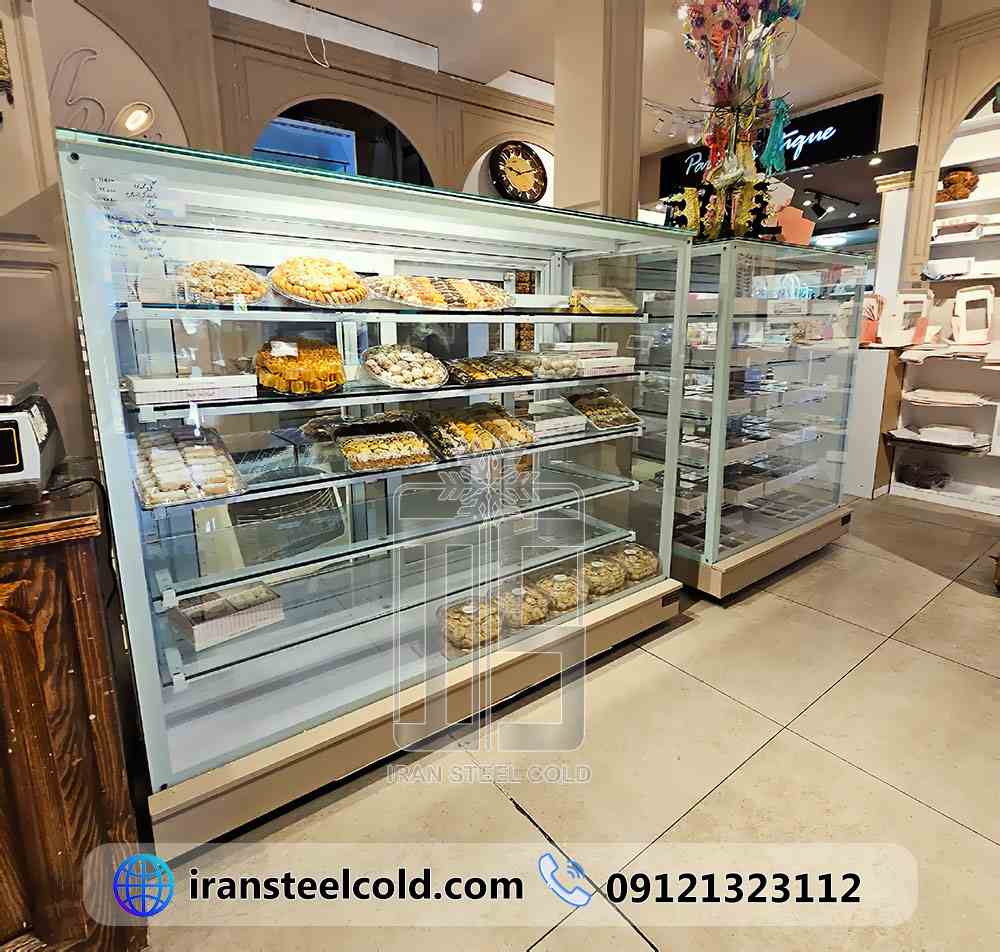 مشاهده بزرگ ویترین شیرینی خشک یخچال ایستاده دکوری یخچال شو کیک یخچال قنادی شیرینی وی آی پی کیک شعبه ۳